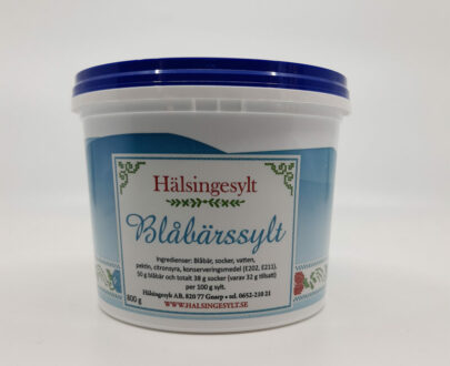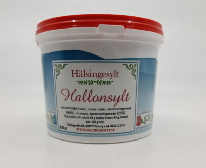 25g hallon, 20 g blåbär och totalt 38g socker per 100g sylt.
