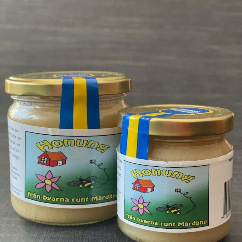 Honung från bigårdar ca 1 mil norr om Gävle. Fast i konsistensen. I kartong med 15st burkar.