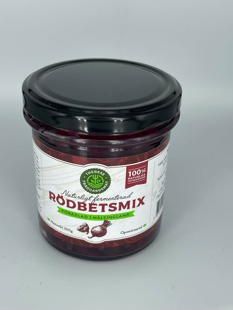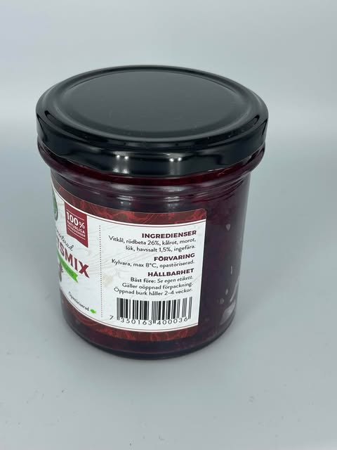 Naturligt fermenterad produkt på grönsaker från odlingar i Hälsingland och Gästrikland. Ingredienser: vitkål, rödbeta 26%, kålrot, morot, lök, 1,5% havssalt, ingefära.